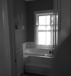 The former layout included an oversized, unused jet tub. Outdated red paint and an unnecessary dividing wall made the space appear dark and small.
